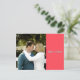Este cartão-postal de Save the Date é projetado de forma simples com blocos de cores coral, verde e cinza. Apresenta uma imagem na frente com nomes impressos sobre um bloco de cor coral. Os detalhes são indicados no verso sobre um bloco de cor cinza. Blocos de cores verde e cinza dividem o verso, sobrepostos com texto em verde.