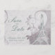 Espirais ondulam e se enrolam em torno de uma Torre Eiffel desenhada à mão em um tom de tial verde escuro, contra um padrão de damasco floral roxo luxuoso. Um poema de amor francês é tenuamente inscrito no fundo prateado, fornecendo o acompanhamento perfeito para a redação personalizável do save the date em fontes de caligrafia e estilo de gravação.