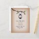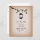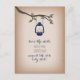 Um casamento ao ar livre salve o cartão postal com a ilustração de uma lanterna azul de acampamento pendurada em um galho de árvore com folhas verdes. O plano de fundo é o estoque de cartões inspirado. Personalize o texto com suas informações.