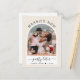Cartão postal moderno de creme e branco para anúncio de casamento íntimo ou fuga para informar familiares e amigos que os planos de casamento mudaram, exigindo que você fuja ou reduza o número de convidados em seu casamento para um pequeno grupo íntimo, mas que você realizará uma festa de celebração no futuro. A frente apresenta sua foto em uma moldura arqueada e "Casados Agora, Festa Depois" em uma mistura de tipografia simples e escrita na moda. Sob sua foto, você pode adicionar seus primeiros nomes e data de casamento. No verso, você pode personalizar sua mensagem com mais detalhes e seus nomes em uma escrita semelhante a uma assinatura.