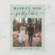Anúncio de casamento moderno ou cartão postal de noivado para informar familiares e amigos de que os planos de casamento mudaram, exigindo que você fuja ou reduza o número de convidados em seu casamento para um pequeno grupo íntimo, mas que você realizará uma festa de celebração no futuro. A frente apresenta sua foto e "Casados Agora, Festa Depois" em uma mistura de tipografia simples e escrita moderna contra um fundo verde suave. Sob sua foto, você pode adicionar seus primeiros nomes e data de casamento. No verso, você pode personalizar sua mensagem com mais detalhes e seus nomes em uma escrita semelhante a uma assinatura.