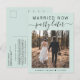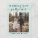Cartão-postal moderno de anúncio de casamento ou fuga para informar familiares e amigos que os planos de casamento mudaram, exigindo que você ficasse noivo ou reduzisse o número de convidados em seu casamento, mas que você irá realizar uma recepção ou festa de celebração no futuro. A frente apresenta sua foto e "Casados Agora, Festa Depois" em uma mistura de tipografia simples e escrita na moda. Sob sua foto você pode adicionar seus primeiros nomes e data de casamento. No verso você pode personalizar sua mensagem com mais detalhes e seus nomes em uma escrita semelhante a uma assinatura.