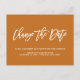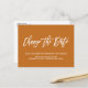 Precisa adiar ou remarcar o seu casamento? Alerte seus convidados de que a data do seu casamento mudou com este anúncio de adiamento de casamento ou mudança de data elegante, que apresenta uma caligrafia moderna com a expressão "Mudar a data" em branco sobre um fundo rústico contemporâneo.