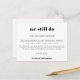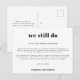 Quando as circunstâncias infelizmente significam que é necessário adiar o seu casamento, um cartão-postal conveniente permitirá que você informe seus convidados. Este design tipográfico minimalista em preto e branco é totalmente personalizável. Personalize facilmente o texto na frente e no verso. Você também pode alterar os estilos e cores da fonte e as cores do fundo, se desejar, através da opção personalizar mais. Se precisar de ajuda, por favor me envie uma mensagem.