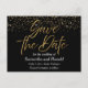 Um cartão postal save the date com fundo preto e brilho dourado falso.