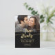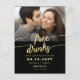Um casamento de fotos único e engraçado "FREE DRINKS AND A WEDDING ON THE SIDE", salve o cartão postal. A design apresenta "bebidas livres" em uma bela fonte de folha de ouro falso, escrita à mão, sobre fundo preto, e tem espaço para uma foto de orientação paisagística. Na parte traseira do cartão postal, o design apresenta opções para mais detalhes, incluindo espaço para um endereço de retorno. Personalize o design substituindo o texto do exemplo e a foto. Mais estilos estão disponíveis em nossa loja.