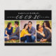 Esse casamento de na moda salve a data em que os cartões postais de lançamento incluem três fotos de noivado de 2 x 3" com a data em destaque no escrevendo de script. Personalize o texto da modelo de cartão na frente e atrás do cartão postal para o seu grande dia. A cor preta do fundo e as cores do texto podem ser personalizadas para coordenar com o esquema de cor do casamento.