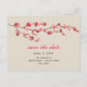 Um simples casamento moderno salve o cartão postal com uma ilustração inspirada pela aquarela de um galho de cereja rosa florescendo sobre um fundo de branco profundo. Texto vermelho e marrom personalizável. Procure convites para casamento, cartões de Rsvp, correio e etiquetas de endereço na Paperie de Jill.