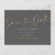 A moderna e elegante fachada de folha de ouro cinza casamento salva a data com uma caligrafia casual e legal.