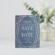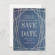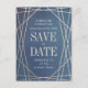 ***Você pode personalizar toda a aparência da suíte de casamento usando o botão "Personalizar" para mudar a cor de fundo para uma de sua escolha por uma aparência totalmente personalizada.*** Lavagens profundas de azul, reminiscentes de lapis lazuli, são acentuadas com linhas de faceta geométricas, de champanhe falso em ouro detalhado para fazer com que isso salve o cartão postal de data uma escolha moderna e nova para sua celebração elegante e romântica do amor. Personalize este cartão-postal com os seus nomes, data de casamento, localização e URL do site de casamento para ajudar os seus convidados a fazer arranjos de viagem para o grande dia. Não se esqueça de personalizar ambos os lados com todos os seus detalhes de casamento!