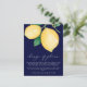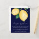Adia o seu casamento? Envie este anúncio de mudança de planos para informar os seus convidados. Este anúncio apresenta limões amarelos de aquarela e folhas verdes, aludindo à frase popular "quando a vida lhe dá limões, faça limonada". O fundo é de um azul naval impressionante, com "mudança de planos" em caligrafia moderna branca e a sua mensagem em fonte sans serif branca.