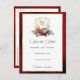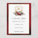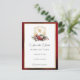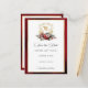 Casamento elegante, mas festivo, com tema de férias, salvo a data design com crista floral de ouro clássico, desenhado à mão, marcada por um spray colorido de flores e verduras de Natal vermelhas e brancas. Este modelo formal personalizado inclui campos de texto editáveis, além de gráficos de texto de caligrafia personalizados e borda dourada. A parte traseira apresenta campos de texto adicionais e gráfico floral de Natal complementar.