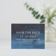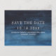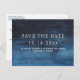 Cartões-postais modernos e masculinos de salve a data com um design simples com o título, "Salve a Data" em letras brancas grandes em uma fonte serifada e os detalhes do seu casamento em uma fonte sem serifa sobre um fundo de lavagem de aquarela azul marinho escuro. Adicione seu endereço de devolução e mensagem pessoal no verso. A cor azul-marinho torna este design ótimo para um casamento de inverno sombrio.