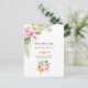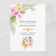 Cartão postal de convite de casamento de praia floral em aquarela com hibiscos laranja e rosa, folhas tropicais e um abacaxi, projetado para ser personalizado rápida e facilmente de acordo com os detalhes do seu evento.