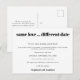 Quando, infelizmente, a situação exige que você mude a data do seu casamento, um cartão-postal conveniente permitirá que você informe seus convidados da nova data o mais rápido possível. Este design tipográfico minimalista em preto e branco é totalmente personalizável. Personalize facilmente o texto na frente e no verso. Você também pode alterar os estilos e cores da fonte e as cores do fundo, se desejar, através da opção "personalizar ainda mais". Se precisar de ajuda, por favor me envie uma mensagem.