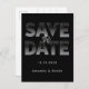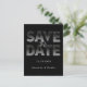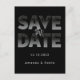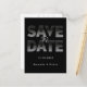 Um design minimalista com letras gotas pretas de brilho formando as palavras SAVE DATE sobre fundo preto com tipografia prateada. Envie este cartão postal elegante e chic Salve a data para seus amigos e família para anunciar seus núpcias futuros. Você pode personalizar o texto adicional na parte traseira do cartão para adequá-lo ao seu estilo.