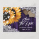 Este casamento de madeiras rústicas, burlap e girassol de rendas, exceto os cartões postais são ideais para sua festa de casamento rústica roxa inspirada pelas flores de girassol. Itens correspondentes disponíveis.