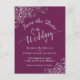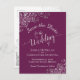 Este belo cartão postal foi feito para avisar seus amigos e família do seu casamento. Ele apresenta um design simples, mas elegante, com caligrafia de cinza pálida e caramujos e espirais friamente prateados nos cantos de um fundo roxo, magenta ou cor de baga. O verso tem um gráfico de "lápis em" bonito assim como espaço para um site e outras informações.