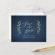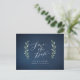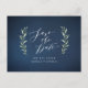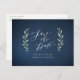 Convite moderno de save the date com caligrafia chic e design de folhagem verde em aquarela sobre fundo azul marinho, simples e elegante, ótimo para casamento rústico, casamento de primavera e casamento de verão.