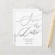 Elegante e moderno salve a data modelo, com um texto caligrafia manuscrito que diz "Salvar a Data" em prata falso em um fundo branco. Na parte de trás do cartão você pode adicionar uma breve mensagem de seu relacionamento e como você está animado para sua celebração de casamento. Esta design de tipografia é simples, mas na moda!