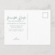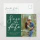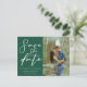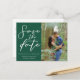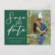 Este cartão postal de casamento verde esmeralda com data de salvamento apresenta letra cursiva branca clássica para um casal que vai se casar em uma floresta ou outro local natural. Personalize com a sua foto de noivado favorita do casal. Celebre o seu amor com esta cor tranquila e coordene com a nossa coleção de tipografia minimalista correspondente.
