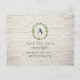 Um cartão postal de salvar a data de casamento com um círculo verde com monograma sobre um fundo de tijolo branco. Convites de casamento correspondentes e outros itens coordenados podem ser encontrados em Jill's Paperie.