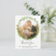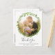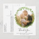 Cartão postal de agradecimento de casamento rústico com sua foto dentro de uma coroa de folhas de oliveira verde. Sua mensagem e nomes estão abaixo em uma fonte cinza médio. Este design é ótimo para um casamento de verão.