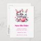 Save the date postcard with an illustration featuring 2 white furry bunnies sharing a big PINK heart. The girl bunny is wearing a cute bow on her head and heart-shaped glasses. The boy bunny is wearing an adorable little suit with a tie.