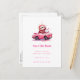 Save the date postcard with an adorable illustration. A happy looking sloth sitting in a sporty pink convertible. Waving as he drives by. With hearts floating upwards.