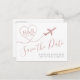 Casamento de Destino Cor-de-Rosa Blush Dourado Salve o Cartão-Postal com um monograma cardíaco divertido de avião, além de elegante e mínima tipografia moderna. Clique em "Personalizar mais" para obter recursos extras de edição, como alterar a cor do texto, a fonte e o layout. Excelente para locais de casamento tropicais, praias, ilhas, cidades, montanhas e aventuras para os quais seus hóspedes estão viajando. Verifique nosso compro de designer para toneladas de itens coordenadores!