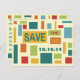 Cartão postal colorido de anúncio de data para salvar com arte abstrata pop, com design gráfico por Artinspired. O design moderno apresenta quadrados e retângulos. Este cartão postal de anúncio de data funciona bem para casamentos, aniversários, festa surpresa, formatura, festa de debutante, bar mitzvah, bat mitzvah, reuniões, campanhas de arrecadação de fundos e muito mais.