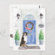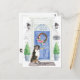 Anuncie seu novo endereço com nosso anúncio elegante com um cão de montanha de Berna, porta da frente azul, tapete de boas-vindas, placa de ardósia, topiárias e uma coroa floral sobre um fundo de tijolo cinza.