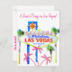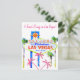 Convites de despedida de solteira em Las Vegas em cartões postais com divertidas palmeiras cor-de-rosa. O design impresso tem brilho simulado na imagem, assim como o famoso letreiro de neon da recepção, que faz parte do colorido design.