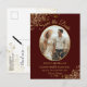 Este belo cartão postal foi projetado para avisar seus amigos e família do seu próximo casamento. Ele apresenta um simples, mas elegante design com texto dourado sobre fundo vermelho-burro ou-tijolo, e sua foto em um quadro oval cercado por caramujos e espirros de folhas falsas e douradas friamente. O verso tem um gráfico fofo que lê "nos lápis" e espaço para uma nota personalizada.
