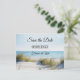 Um adorável cartão de reserva da data com uma imagem de dunas com vista para uma praia e oceano. Perfeito para um casamento de praia planejado.