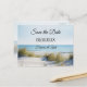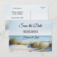 Um adorável cartão de reserva da data com uma imagem de dunas com vista para uma praia e oceano. Perfeito para um casamento de praia planejado.