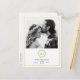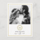 Este modelo de cartão-postal de save the date para casamento apresenta suas iniciais em um círculo dourado ornamentado na frente com uma borda dourada. Ativamos o filtro preto e branco, então a foto colorida com a qual começamos aparece em preto e branco. Esta é a configuração padrão, mas você pode desativar esse filtro se tiver uma foto colorida e não quiser alterá-la para preto e branco. Você pode alterar a cor e a fonte do texto em ambos os lados para se adequar ao seu estilo. No verso, o círculo dourado com suas iniciais é apresentado novamente, junto com seus nomes, etc. Você pode excluir o "entregar para" no verso e também pode excluir as linhas para as informações do destinatário se preferir um visual mais simples. Torne este cartão-postal exclusivamente seu com as ferramentas de design intuitivas e sua inspiração!