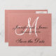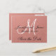 Elegante cartão postal Faux Dourado Rosa e Preto Save the Date. Elke Clarke© para MonogramGallery na Zazzle. Anúncio de casamento moderno e simples com efeito de foto em folha de ouro rosa impresso. Uma inicial de monograma branca em tipografia cursiva com texto preto sobreposto. Totalmente personalizável. Outras cores e efeitos de fundo disponíveis.