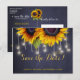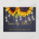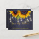 Casamento rústico elegante de outono, cartão postal de modelo de "save the date" em quadro negro azul-marinho escuro com girassóis grandes e lindos e uma sequência de luzes cintilantes. Preencha suas informações nos espaços; você pode optar por personalizá-lo ainda mais, alterando a cor do fundo, fontes e cores das letras. ---- O convite é adequado para casamentos rústicos de verão ou outono / casamentos no jardim ao ar livre ou quintal. --- Se precisar de ajuda para personalizá-lo, entre em contato!