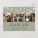 A foto de casamento verde senador elegante salva os cartões postais com uma fonte moderna. Nosso casamento salva a data mostra uma coleção de fotos de 3 imagens contra um fundo verde sábio adornado com luzes de cordas. Personalize facilmente esta foto, salve o cartão-postal com suas imagens e detalhes de casamento, incluindo um site de casamento, se desejar. Para pedidos personalizados, envie-nos uma mensagem.