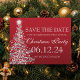 Design Red "Save The Date" (Salve a data) do Partido Natal Elegante com Árvores Prateadas de Natal com Espumantes, e nomes personalizados e texto de data. Imprima sua família e amigos com este na moda e design moderno. Totalmente personalizável! Fácil de usar e fácil de personalizar