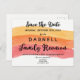 Espessas pinceladas de aquarela falsa em cores quentes de ouro, laranja e vermelho são salpicadas em nosso cartão postal de Encontro da Família Salve a Data. Ousadas o suficiente para se destacar como um lembrete em qualquer quadro de avisos da família ou geladeira. Veja mais em Genealogy Greetings aqui na Zazzle.