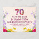 70 de aniversário do cartão postal de anúncio floral moderno de 70 anos do partido Salve a data. Celebre um aniversário marcante com este vibrante aniversário de 70 floral Salve o cartão postal Data. Apresentando números florais coloridos e ousados e um maravilhoso design de inspiração para jardim, este cartão exude elegância e charme. Personalize-o com o nome e os detalhes do evento do celebrante, convidando seus hóspedes a se juntar à celebração alegre. Com as suas flores brilhantes e a tipografia elegante, é a forma perfeita de garantir que os seus convidados marquem os seus calendários para esta ocasião especial. Ideal para o jardim, inspirado na natureza ou celebrações de aniversário floral. Aproveite!