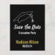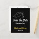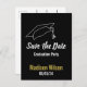 'Salve a Data' para uma festa de formatura com este cartão postal preto, branco e dourado falso. Personalize com o nome do formando em letra cursiva e data da festa. Um chapéu de formando está no topo acima do texto em um fundo preto.