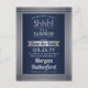 Você consegue guardar um segredo? Convide familiares e amigos para uma surpresa de aniversário elegante e emocionante com convites personalizados de festa com cartão postal de "save the date" nas cores azul-marinho e cinza. Todo o texto neste modelo é simples de personalizar, incluindo a mensagem que diz "Shhh! É uma SURPRESA". O design apresenta uma borda listrada moderna em um fundo de aço inoxidável escovado falso, tipografia art déco vintage clássica e caligrafia estilosa. Por favor, observe que a cor prata é impressa em cor cinza ombre, não em folha metálica. Este cartão pode ser personalizado para qualquer ano ou tipo de evento e é adequado tanto para homem quanto para mulher. Saudações e Feliz Aniversário!