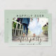 Cartão postal de anúncio de casamento ou fuga romântica moderno em verde-sage ou cartão-postal para informar familiares e amigos de que os planos de casamento mudaram, e que você fugiu ou reduziu o número de convidados no seu casamento, e para convidá-los a uma recepção de casamento ou festa de celebração. A frente apresenta sua foto e "Festa Feliz para Sempre" em uma mistura de tipografia simples e escrita moderna, e seus primeiros nomes e data de casamento. No verso, você pode personalizar sua mensagem e convite em mais detalhes e adicionar seus nomes em uma escrita semelhante a uma assinatura.