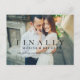 Ousado e divertido, este cartão postal de salva a data apresenta uma foto do casal com uma grande fonte serifada "Finalmente" sobreposta em um design impressionante de fontes mistas. Os nomes do casal e a data do casamento aparecem em elegante letra cursiva abaixo do título. Uma maneira divertida e memorável de anunciar a data do seu casamento com personalidade. O verso do cartão postal inclui todos os detalhes importantes. Todo o texto e a foto são totalmente personalizáveis.