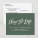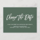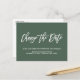 Precisa adiar ou remarcar o seu casamento? Alerte seus convidados que a data do seu casamento mudou com este Anúncio de Adiamento de Casamento Elegante ou mudança de data apresentando uma letra de script da moda dizendo "Mudar a data" em branco sobre um fundo verde floresta contemporâneo.