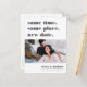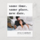 Precisa mudar sua data de casamento? Notificar os hóspedes com este cartão postal moderno e iluminado, com as palavras "mesma hora, mesmo lugar, nova data" em cinza. Personalize com uma foto e adicione seus nomes na parte inferior. Personalize as costas com detalhes adicionais, incluindo sua nova data e uma mensagem pessoal.