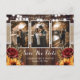 Esses cartões-postais de casamento com foto para salvar a data, com flores rústicas, burlap, renda e fundo de madeira de celeiro são ideais para uma festa de casamento rústica inspirada em girassóis e rosas vermelhas.
